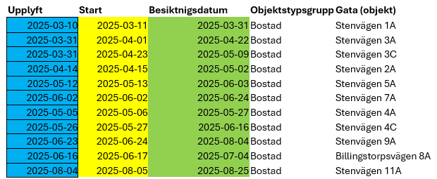 Planerade tider för byte på Stenvägen, Billingstorpsvägen 8A