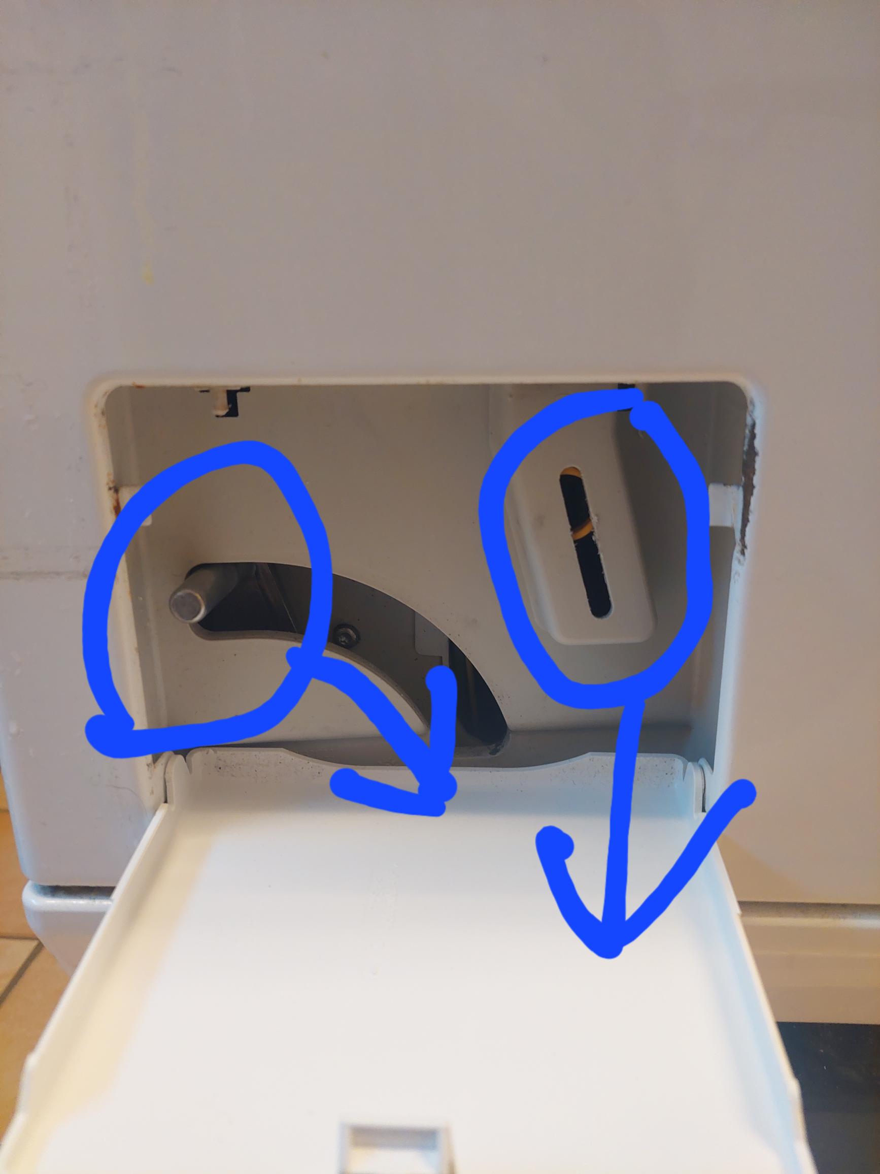 • På andra sidan finns en metall spak/pigg, den drar man höger nedåt (går i en skåra) för att tömma maskinen på vatten. (se bild)